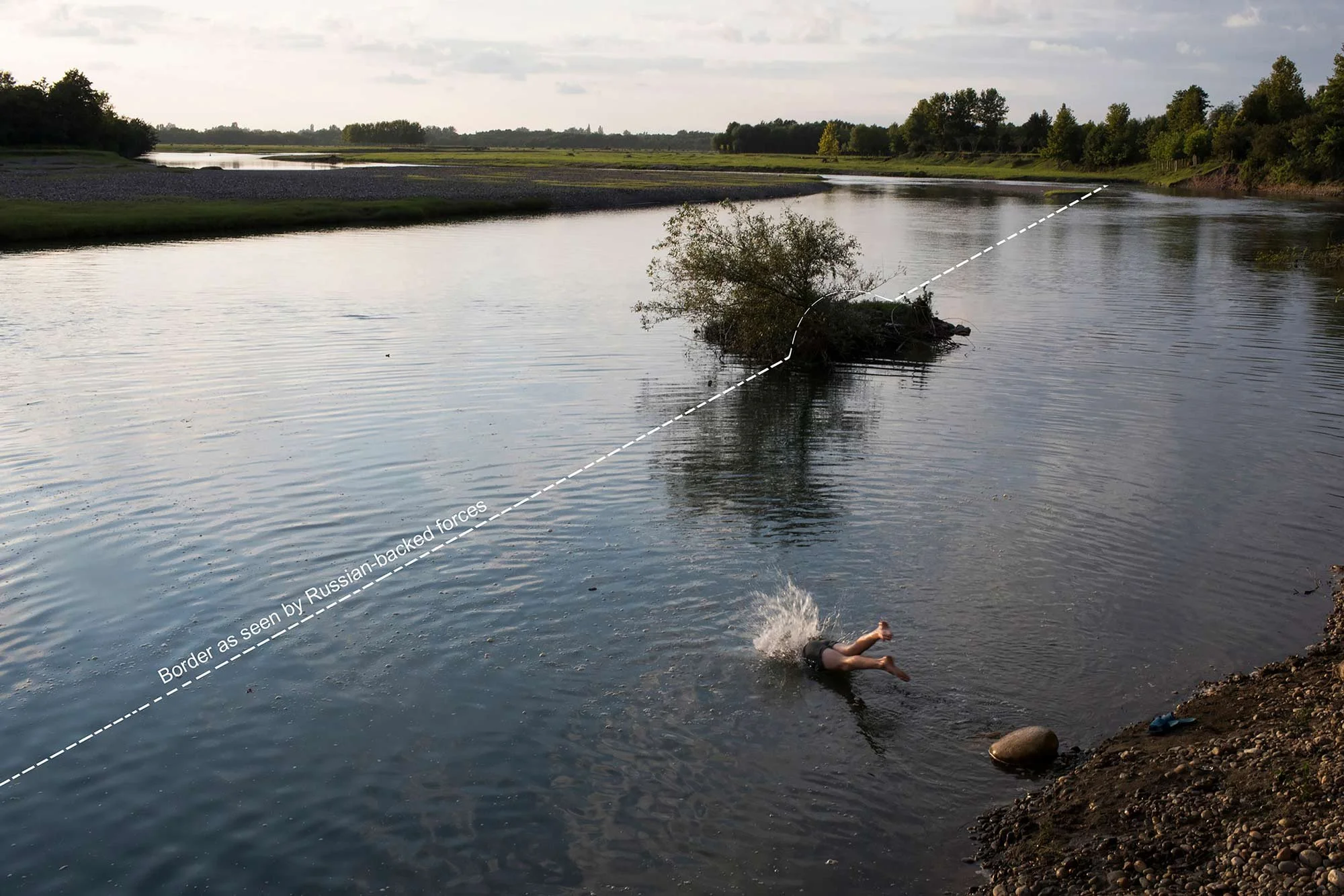 Orsantia village, Georgia, 2017. A child takes a swim in the Enguri River, which is used as the borderline of the Russian-supported separatist territory of Abkhazia. The river was previously known as a good location for safely crossing into Abkhazia, but recent installation of barbed wire fencing and surveillance equipment has slowed those crossings. The border marks on the photo illustrate the words of a local, when she had a small dialogue with a Russian militant standing in a watchtower that overlooked her house near the Enguri river. “I took my grandkids out for a swim on a hot summer day, when the kids were already in the water, one of the Russian militants from the watchtower addressed me to keep the distance, I asked why? He said in Russian that half of the river belongs to Russia and half to Georgia”.