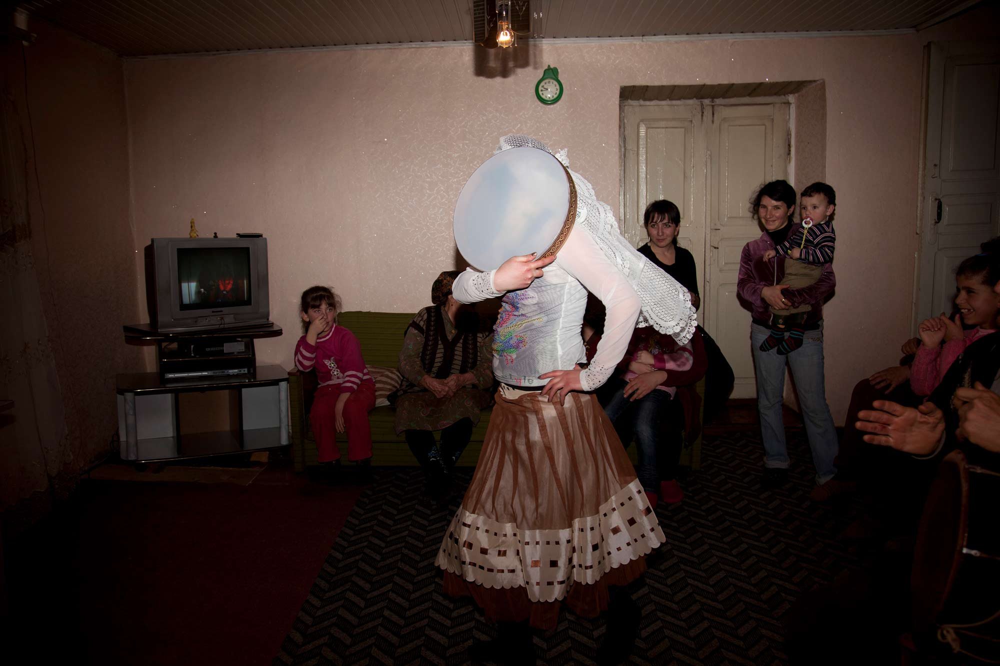 Orja Village, Samtskhe – Javakheti region, Georgia, 2013. Khanum, 18 years old, dances for her friends and neighbors at her house. Khanum was kidnapped twice for forceful marriage. Her father managed to get her back, regardless that it is considered a disgrace if the girl returns home after she has been kidnapped. She now sits at home and is unable to attend University, for her father fears that she will be kidnapped again. From a photo project and documentary movie "Double Aliens".
