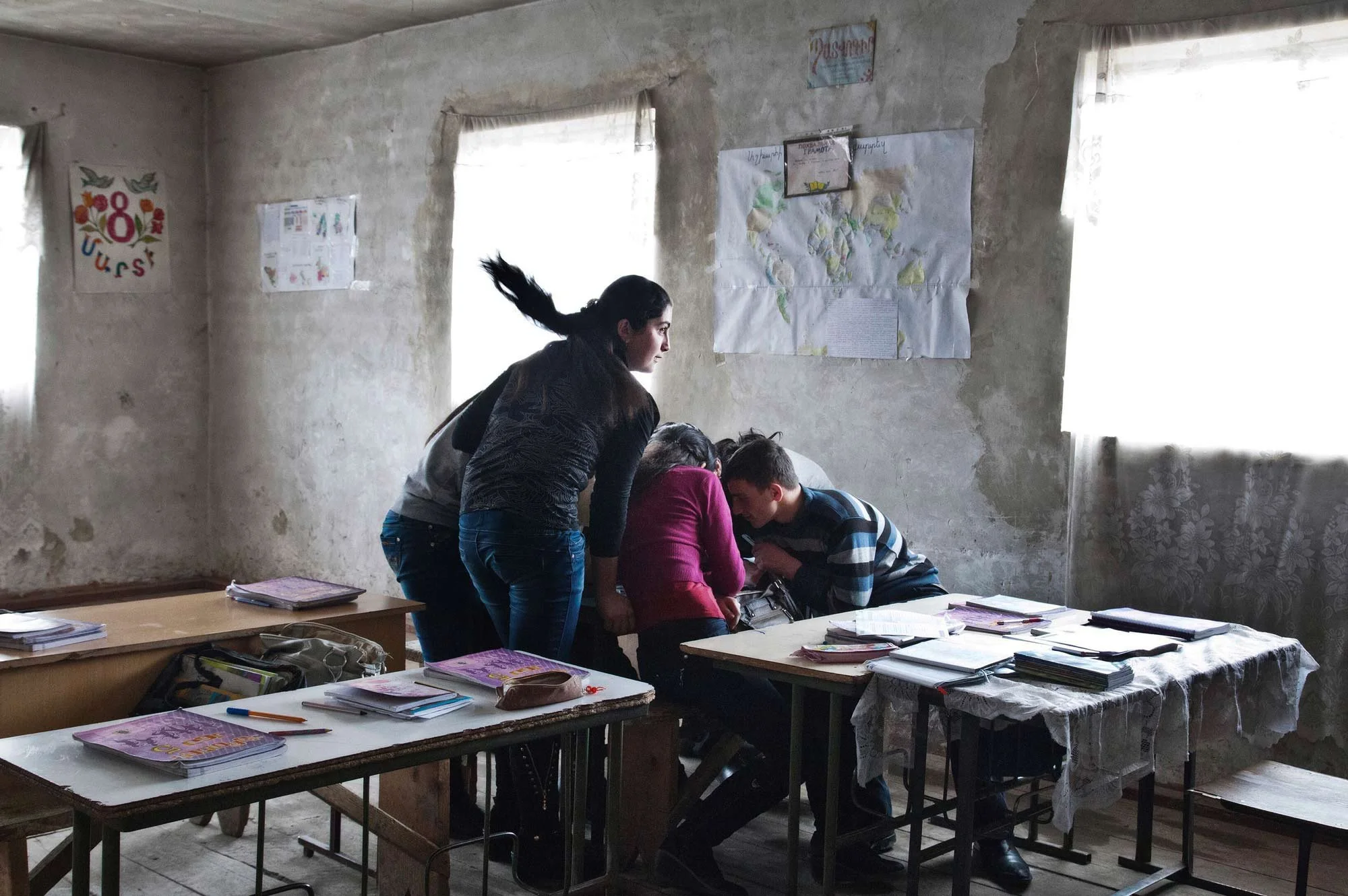 When a teacher leaves the classroom for couple of minutes, 8th graders gather to look at pictures of their friend's wedding party on a mobile phone in a village school in Samtskhe Javakheti region, Georgia.