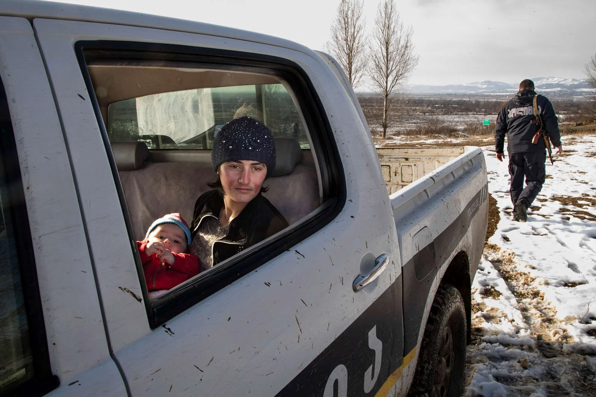 Tatia Adikashvili with one of their children at the border of the Russian-occupied Khurvaleti village. Tatia waits in the police car , while his husband hands a gallon of drinking water over the fence to his mother, who has none on her side. Escorted by a Georgian guard, they avoid arrest by the occupying forces – what they've experienced before.