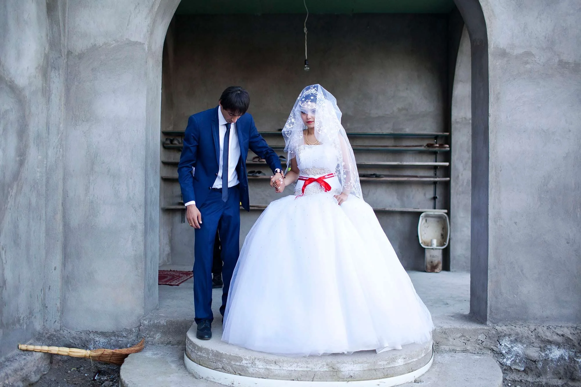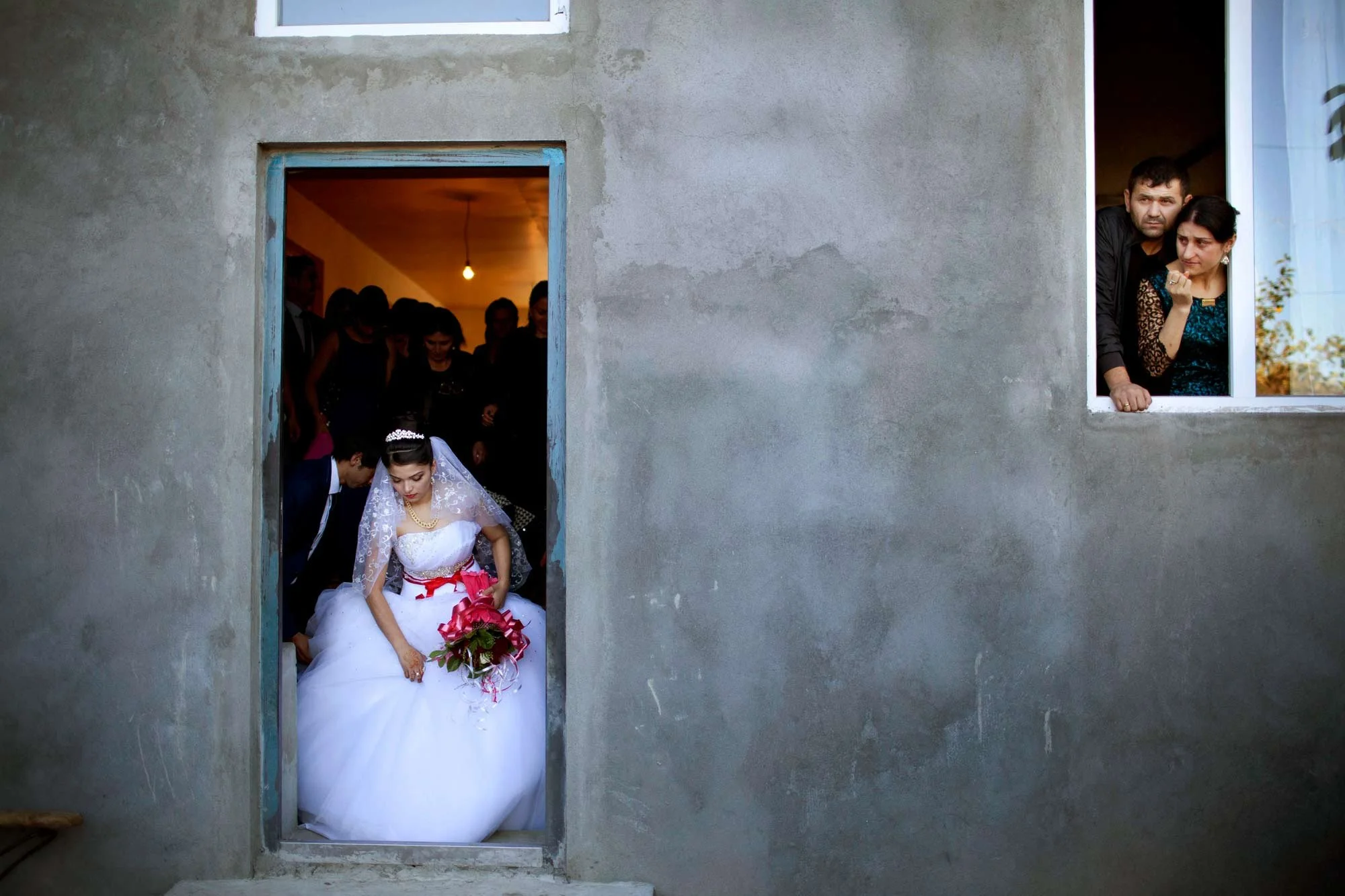 Kakheti region, Georgia, 2005. A 17-year-old bride leaves for her wedding. She met her groom only a month earlier, and while still in school, her age was sometimes reported differently by parents to facilitate early marriage. Her parents are visible on the right, looking out from a window.