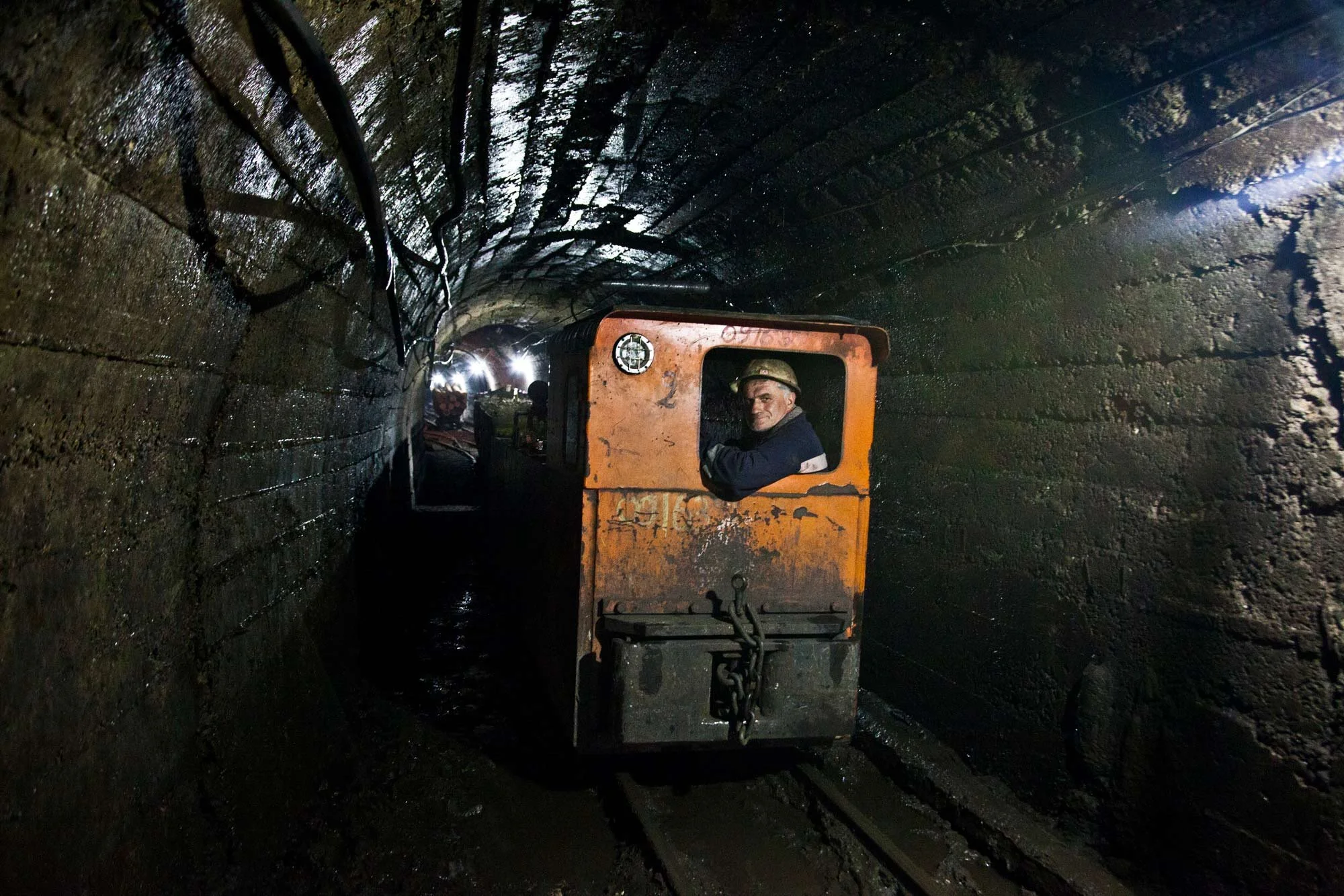 Chiatura City, Georgia. A mineworker sits in a mining train on its way down to the tunnel, working 12-hour shifts for approximately $300 per month.
