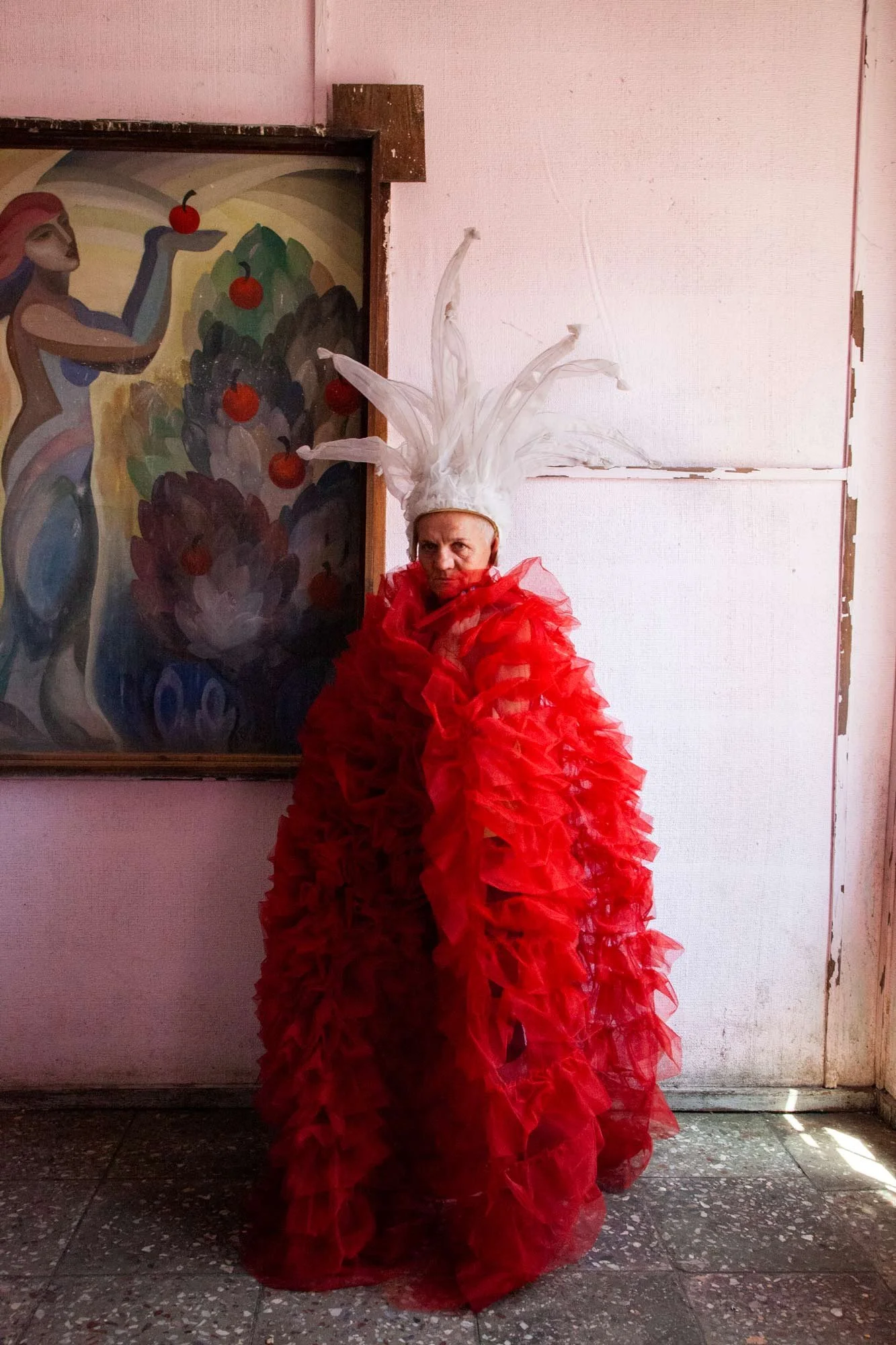 Tbilisi, Georgia, 2013. A female patient at a psychiatric clinic participates in an art therapy session, dressing in a red costume. She prefers to remain anonymous.