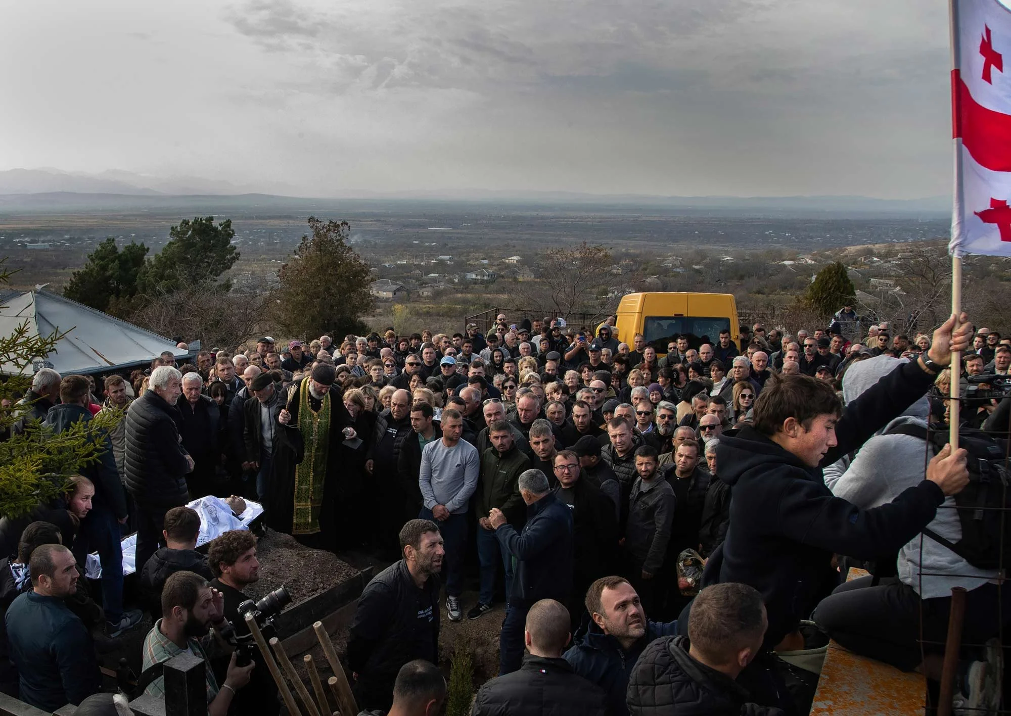 Kirbali Village, Georgia, Nov 11, 2023. On November 6, 2023 Georgian Tamaz Ginturi was shot dead at the Lomisi Church near Kirbali. The church, located in the South Ossetian conflict zone claimed and controlled by Russia, had been barricaded by the occupiers. A video, believed to be taken with Tamaz Ginturi's phone and circulating on social media, shows him and Levan Dotiashvili forcibly entering the church before Russian forces opened fire. Dotiashvili was captured and Ginturi was killed. On November 8, Tamaz Ginturi’s body was laid out in his home village of Kirbali.
