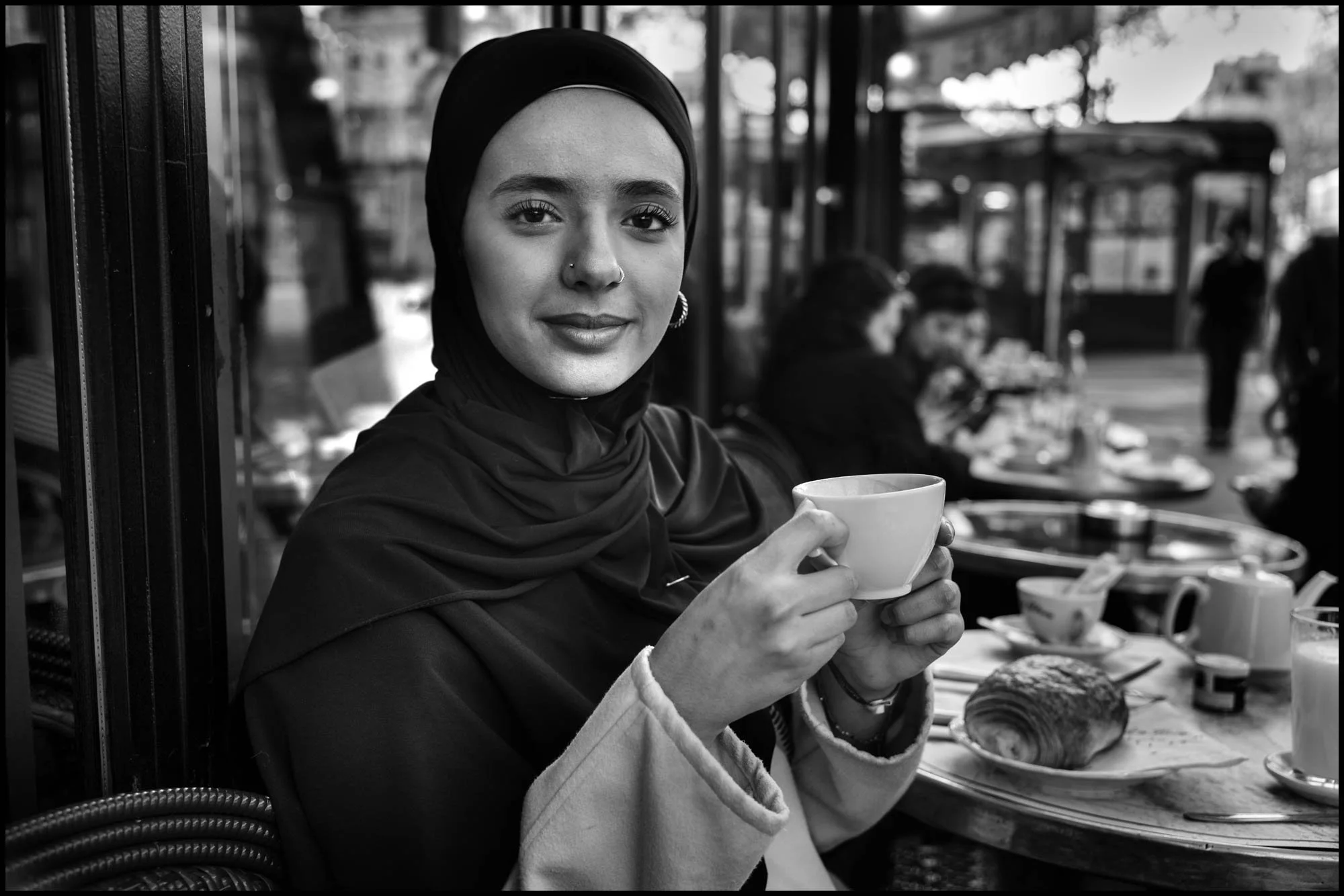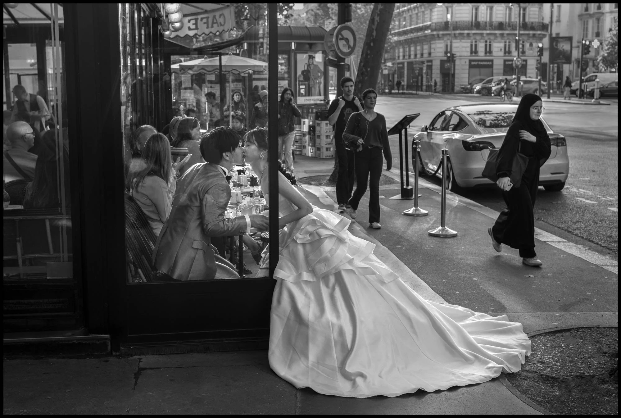 But the grey is also emotional - the space between extremes. In his CBS interview, Turnley describes Paris as offering "life at its very best with family, love, affection, tenderness, and then everything in between, which is most people's daily life." That in-between is where most of us live, and it is precisely what his Paris photographs capture: the woman alone at a cafe table at Cafe de Flore, the couples dancing in front of the Trocadero, the man reading his newspaper with a glass of wine, the children playing in the street.