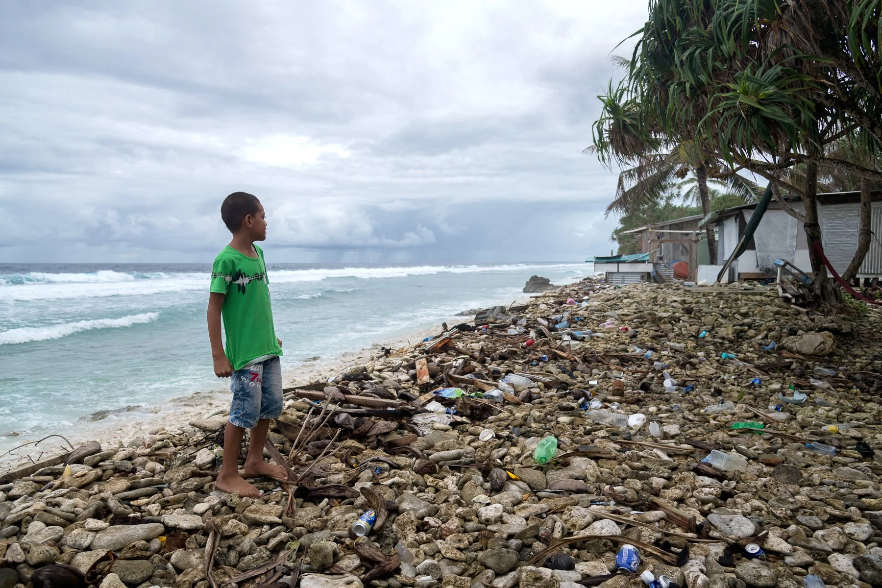 Pacific islanders on Tarawa, Kiribati, in the Pacific Ocean are on their way to visit their family on the next atoll. Twenty years ago, the water didn’t come up to their knees yet.