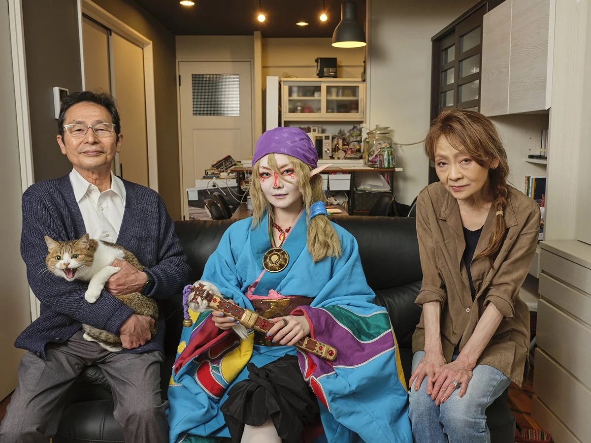 Mahio (40), poses with her parents and their cat on the sofa in their home in Tokyo. Mahio is an employee in a company that deals with planning and marketing for entertainment facilities and has been a cosplayer for 20 years. In the photo she plays the character Medicine Seller (Kusuri) from the anime "Mononoke". With this cosplay she won third place at the World Cosplay Summit 2017.