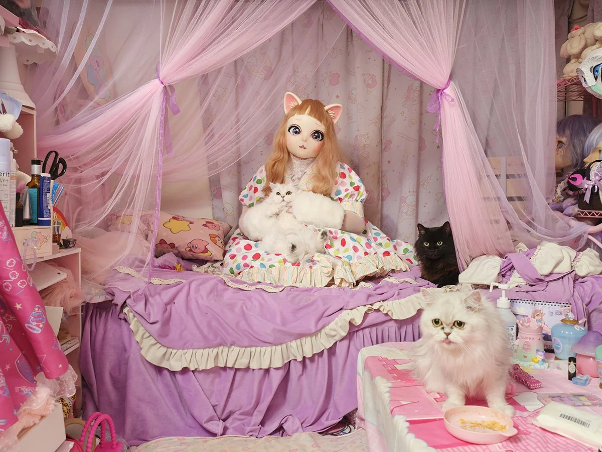 Pitan (33) poses with her three cats, her current family, in her bedroom in Tokyo. Pitan produces costumes for successful young artists from the world of entertainment. In the photo she plays Nenekochan an original cosplay, a doll with the appearance of a cat.