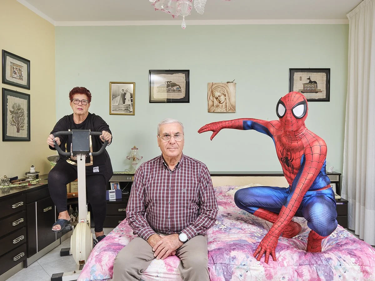Manuel (28) poses with his grandparents in their bedroom in Livorno, Tuscany, Italy. Manuel works as a butcher and has been practicing cosplay since 2018; in the photo he plays Spider-Man, a Marvel Comics character.