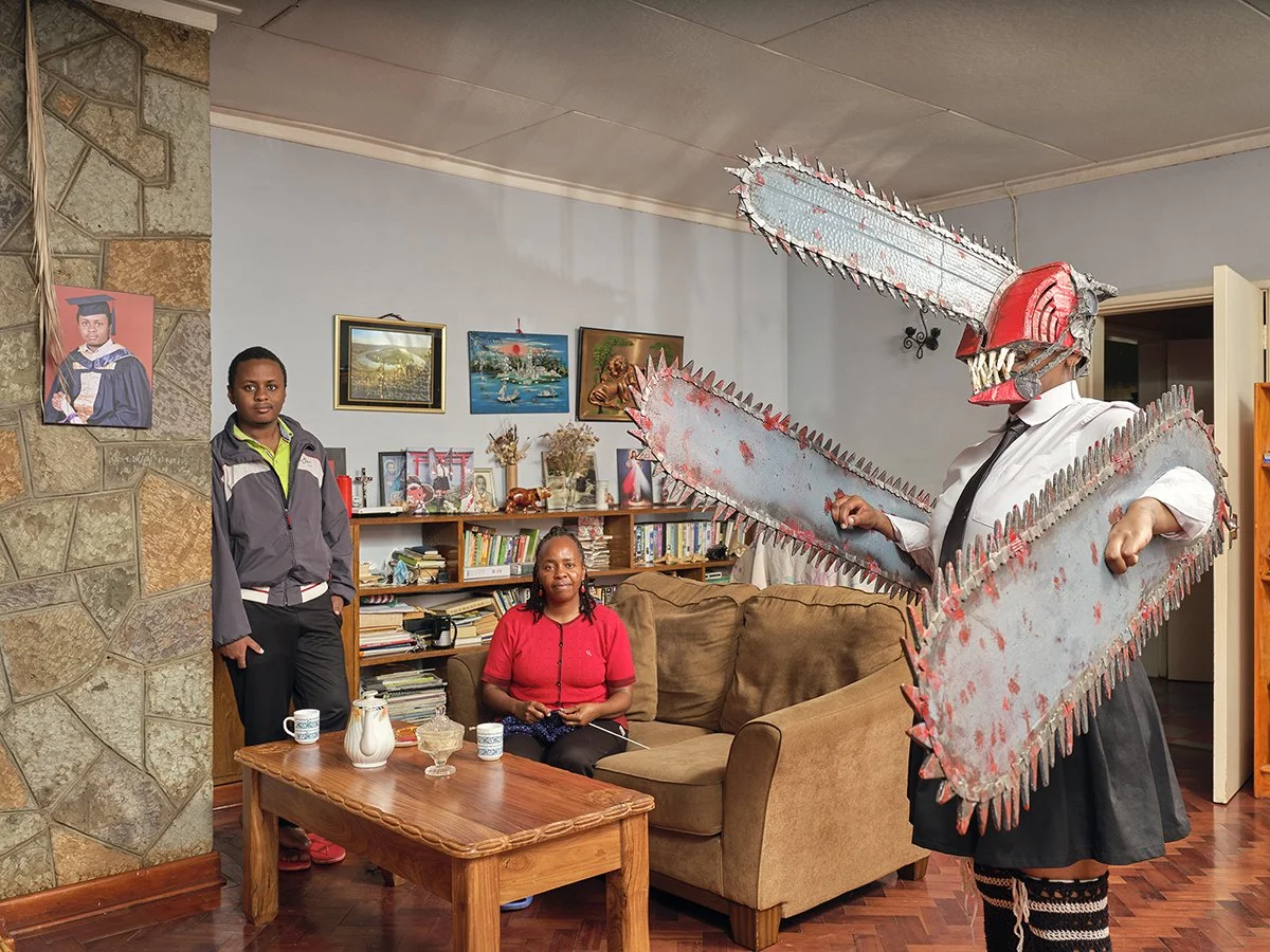 Brenda (24), poses with her mother and brother in their living room in Thika (Kenya); she is a student and has been practicing Cosplay since 2018. In the photo she plays the female version of Chainsaw Man the protagonist in the manga “Chainsaw Man”.