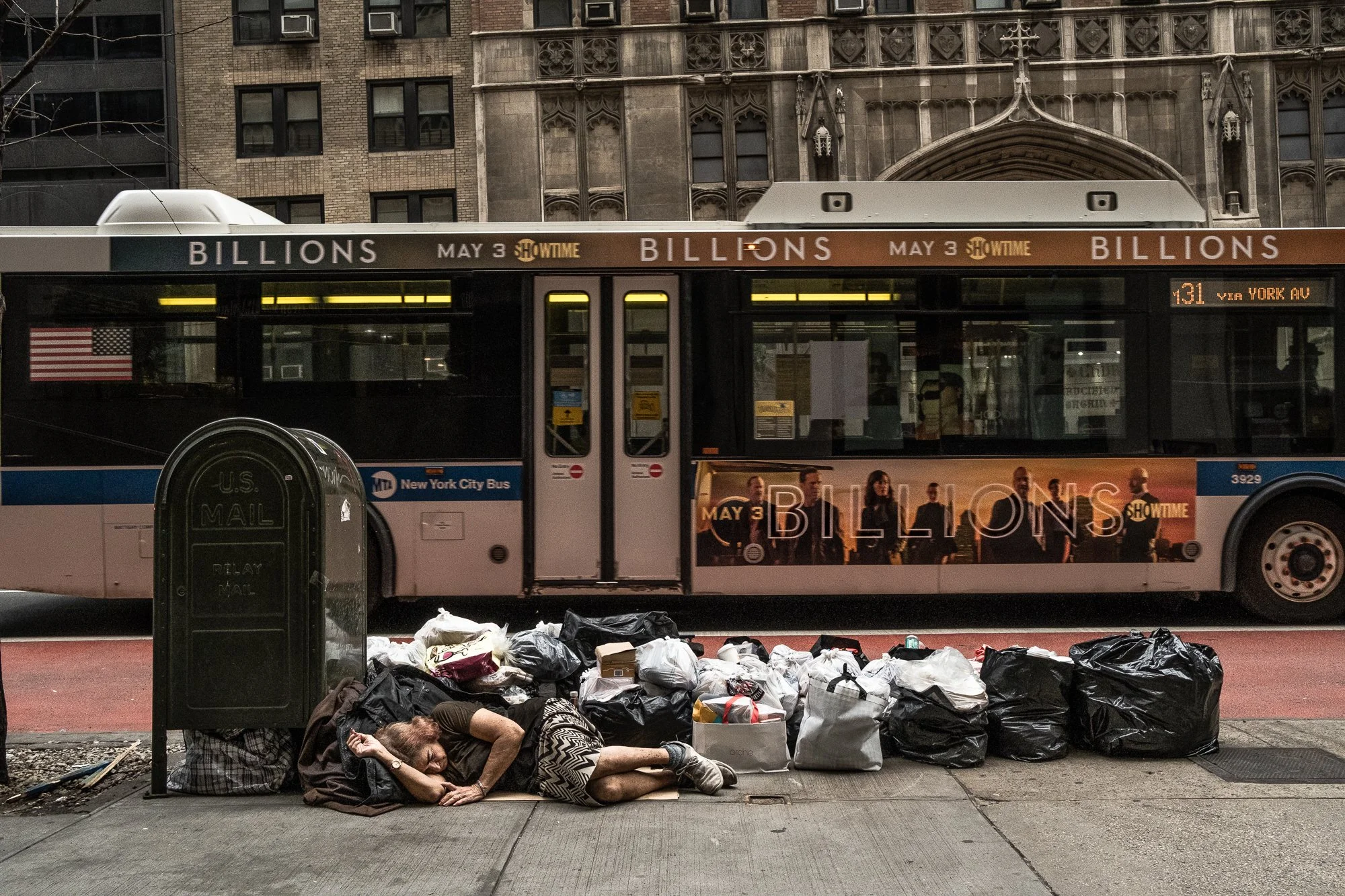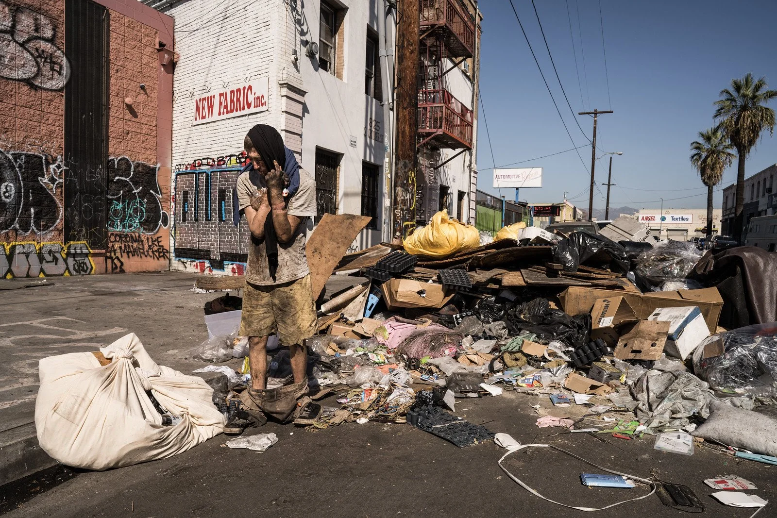SS: It's a really rough picture. I don't want to tear up. I was working on Skid Row for LA Magazine. I had an assignment at Echo Park, but I always go back to Skid Row because it's where my heart is. I had rented a car, which I never do. Right next to downtown LA, you have Skid Row and then you have the Flower District. I was driving through there and I saw this young man and he's the one of the dirtiest people I've ever seen. He's really young, maybe in his early 20s. He's tall, blonde, blue eyed, but he's absolutely filthy. Something just clicked, I pulled over, I grabbed my camera and I started following him. He led me into this labyrinth behind the Flower District, which is actually very dangerous in the daytime, but I have a way of anticipating the scene that I want. So I had to get ahead of him, and he walked right into the frame and he stood in this pile of garbage. It was then that I realized he had really deep ligature marks on his wrists. A ligature mark is when you've been tied up, it’s an indication of being restrained. It was clear to me that he'd been beaten and seriously abused. His pants were coming down. He was obviously a victim of trafficking.